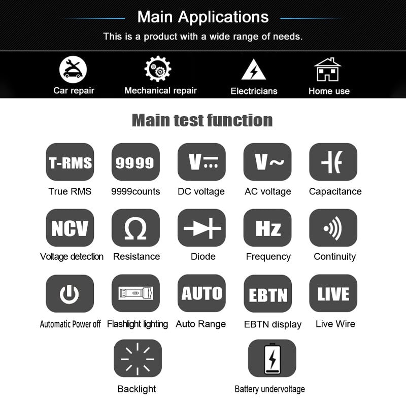 WIDE APPLICATION โ Suitable for multiple tasks including capacitance test, diode test, continuity test, resistance test, live wire check, and DC voltage test.