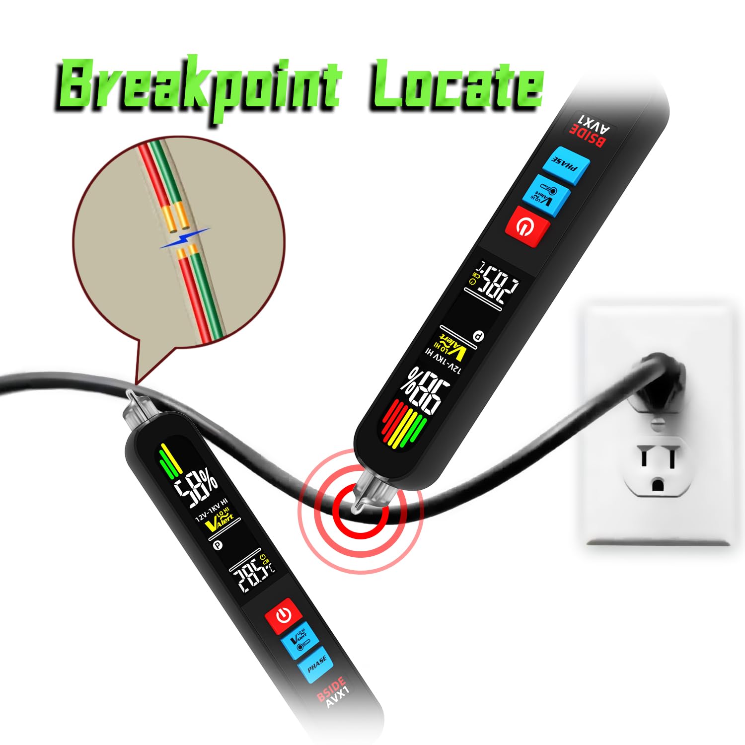 Built‑in battery supports uninterrupted use. Alerts include on‑screen readings, multi‑color flashlight signals, and variable‑frequency buzzer alarms for different voltage strengths.
