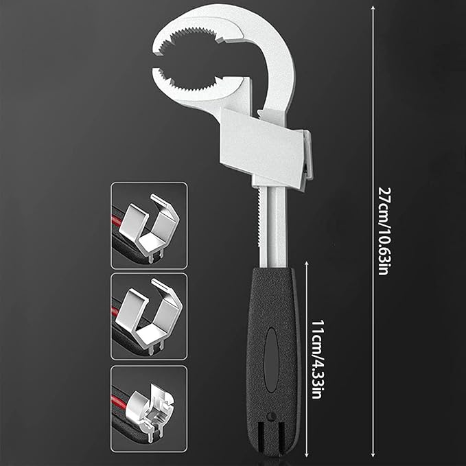 Versatile Double-Head Design: Featuring 3 changeable card slots, including a 3.5cm six-sided chuck, 4.0cm six-sided chuck, and a multifunctional round chuck, this wrench is perfect for various applications, from small spaces to larger pipe adjustments. It rotates smoothly, offering flexibility and ease of use.