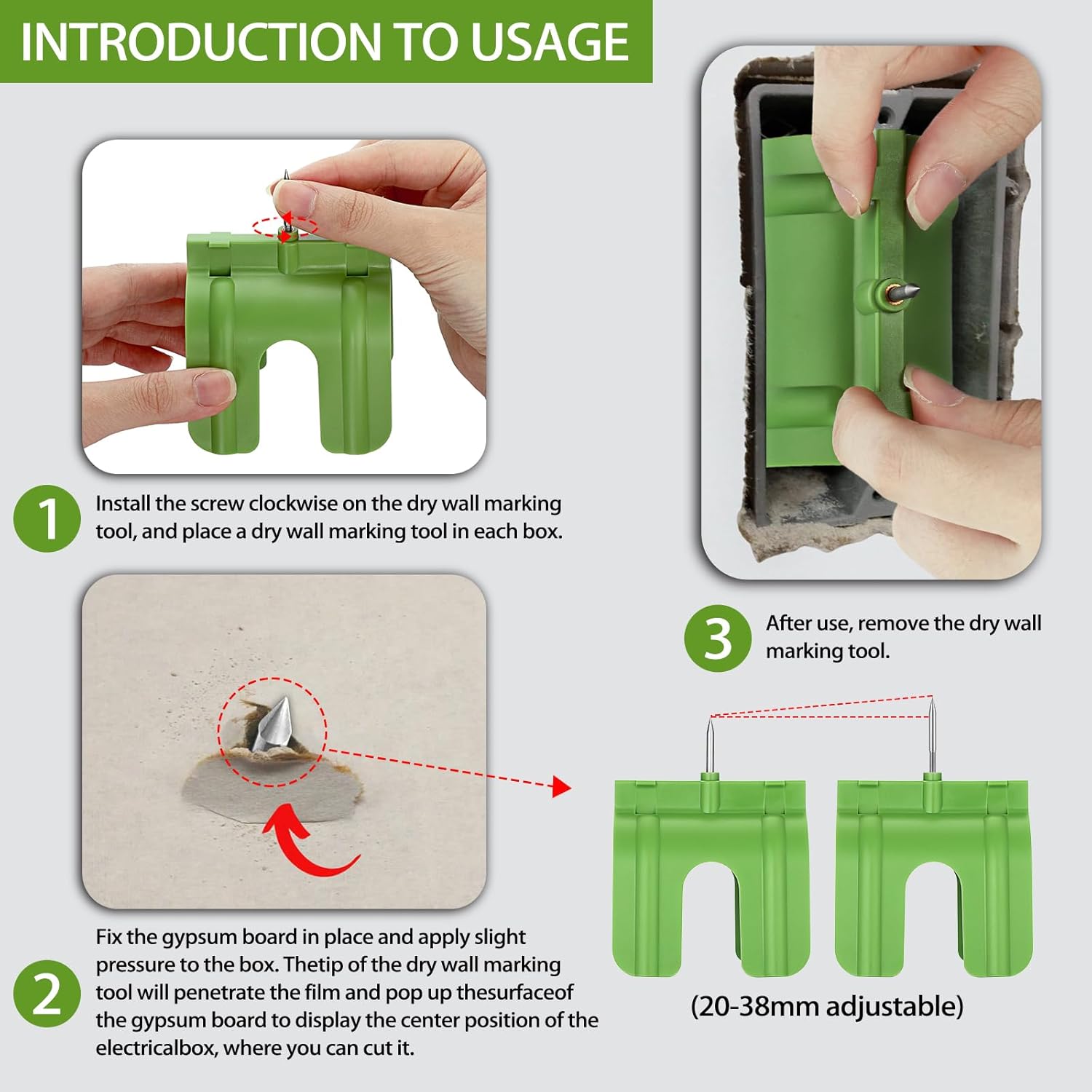 Insert the adjustable 20–38 mm tip through drywall to instantly locate and mark the exact center of your outlet box—no rulers or tape measures needed.