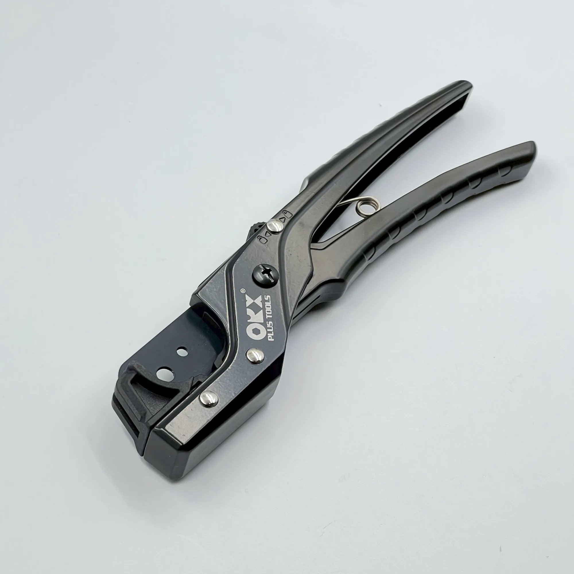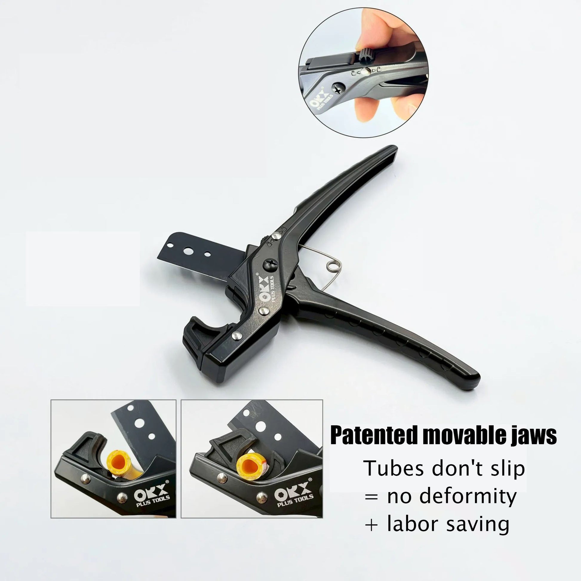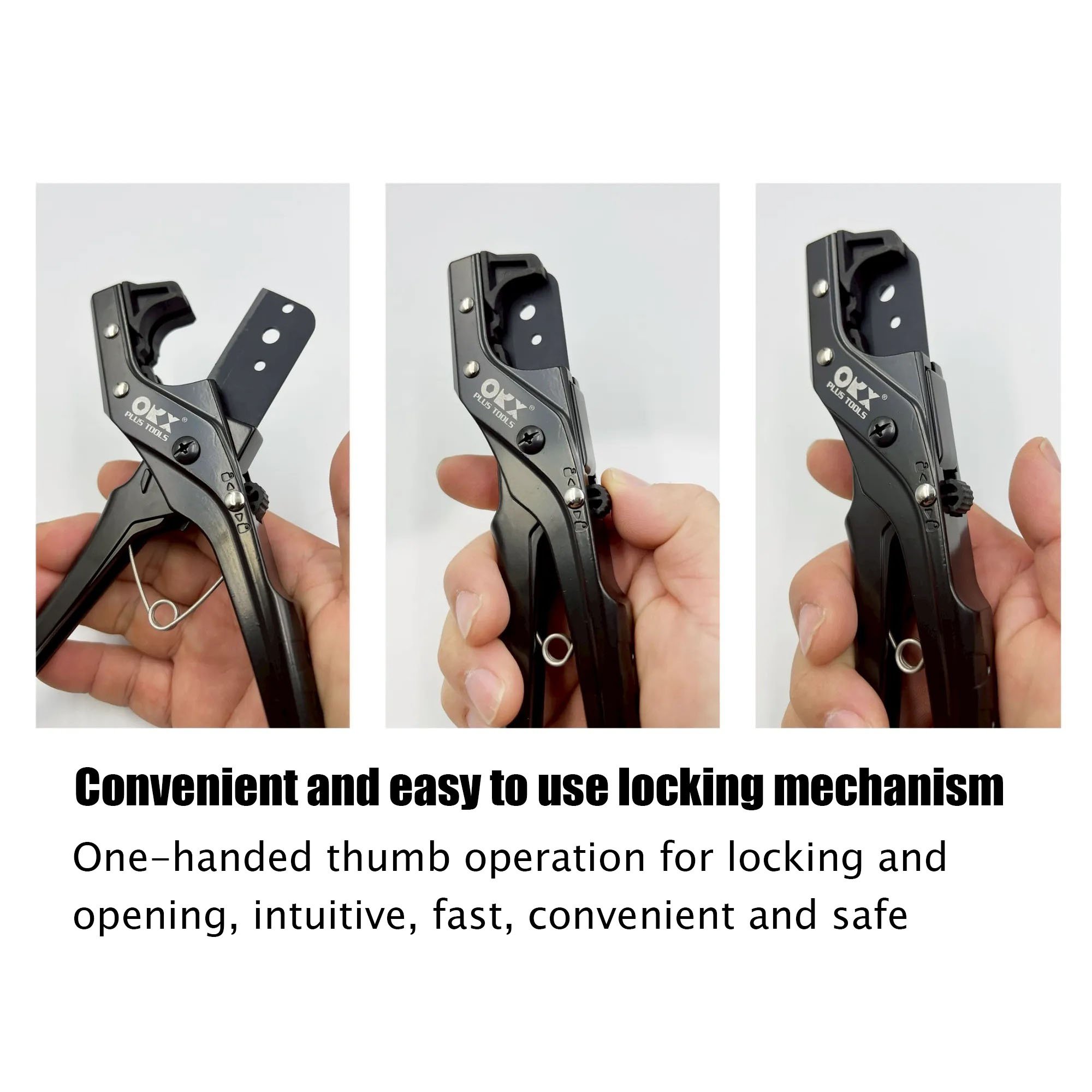 The self‑clamping lower jaw grips tubing securely—no slipping—while the one‑hand lock mechanism keeps the cutter closed for safe, single‑hand operation.