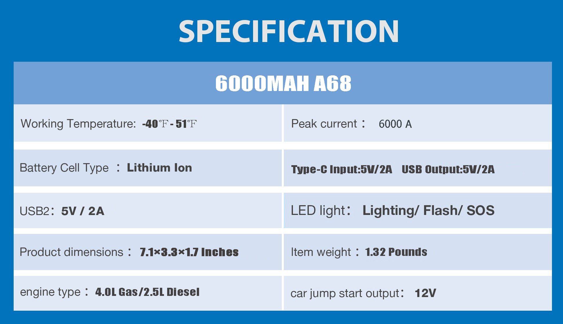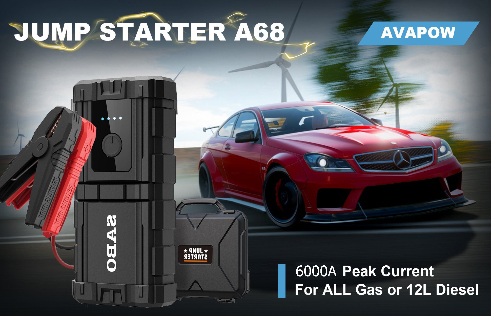 Powerful Battery Starter: This A68 car jump starter provides up to 6000A peak current and high capacity. It can safely start all Gas engines and diesel engines. Suitable for all (12-Volt) cars, trucks, motorcycles, boats, RV or tractor ATVs, UTVs, lawnmowers, snowmobiles, etc.